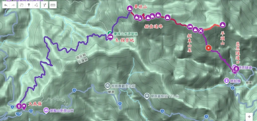 鉅東山屋出發 (07:00)→ 七上八下鋸齒連峰(4.5小時)→ 登上畢祿山(11:30) →(12:00)離開畢祿山→15:00下到8.4K營地(宿)